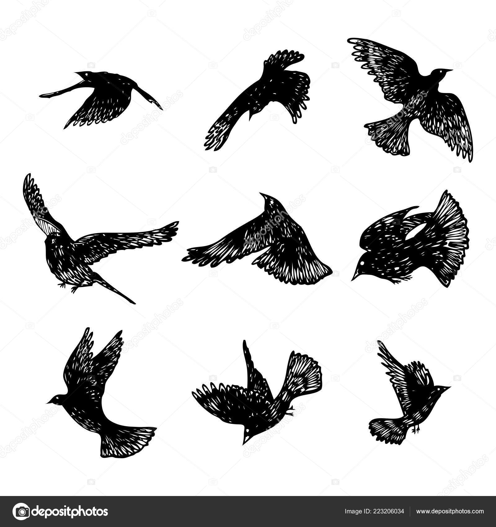 Set Stormo Uccelli Uccelli Che Volano Corvi Disegno Mano - Download