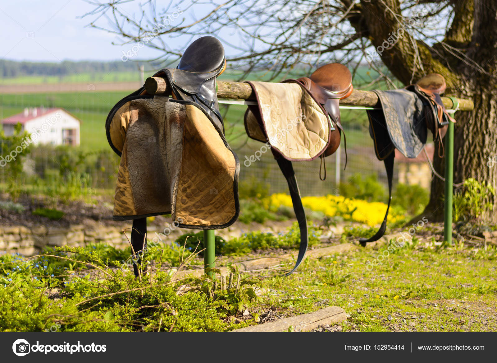 Selle Da Cowboy In Pelle Appeso Sulla Ringhiera Foto Stock - Download