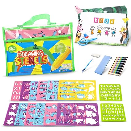 Lenbest Kit Di Stencil E Disegno Kit Completo Per Bambini Oltre 200 Forme Con 12 Stencil Grandi E 2 Piccoli 12 Matite Colorate E 1 Matita - Download