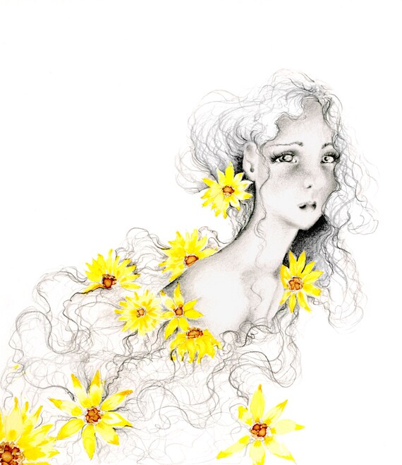Disegno Di Una Ragazza Con Fiore Pittura Girasoli Decora Girasole Parete D Arte Regalo Per Il Suo Fiore Acquerello Pittura Arte Stampa - Download