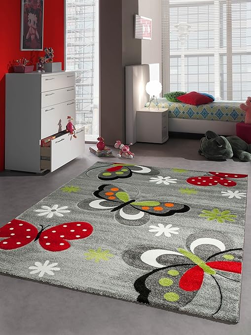 Traum Tappeto Bambini Tappeto Di Gioco Di Disegno Della Farfalla Grigio Rosso Verde Bianco E Nero Grosse 140x200 Cm - Download
